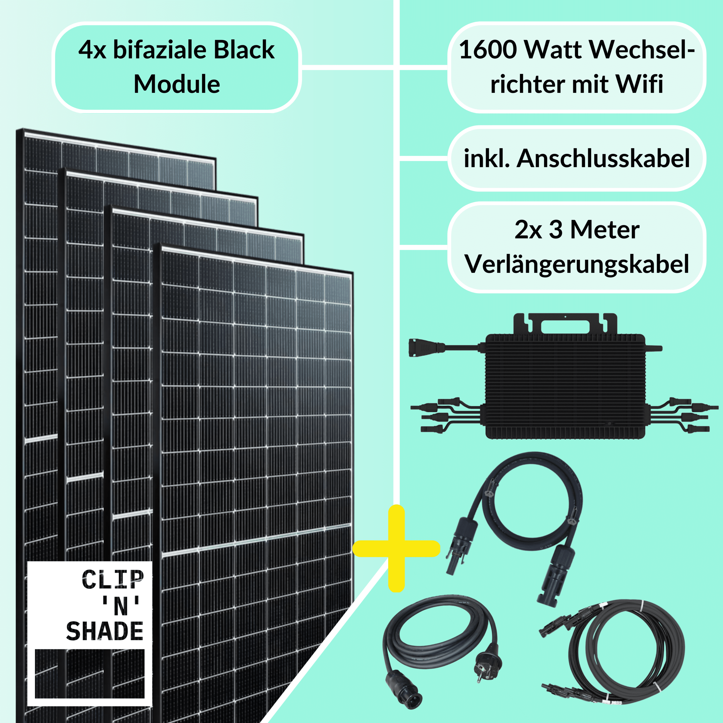 Composé de 4x 430Wp modules Black et d'un onduleur Hoymiles HMS-1600-4T + connexion et câble d'extension