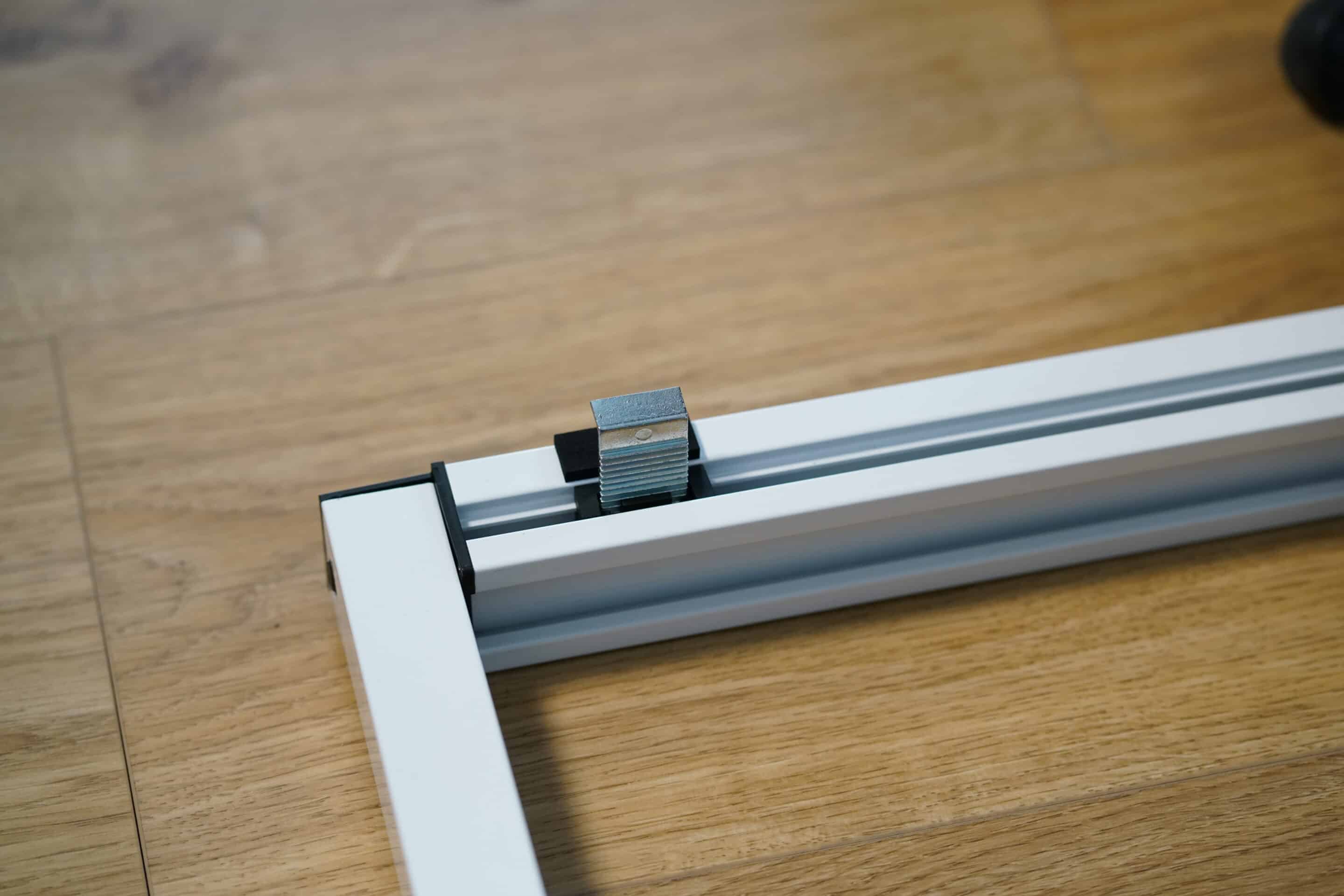 Un clip supplémentaire dans le profil d'assemblage (pièce n° 4) permet d'installer notre store même en cas de très faible dépassement de la canne et de rails de pluie. Le clip supplémentaire augmente la surface d'appui et répartit ainsi mieux le poids du store extérieur sur le cadre de la fenêtre.