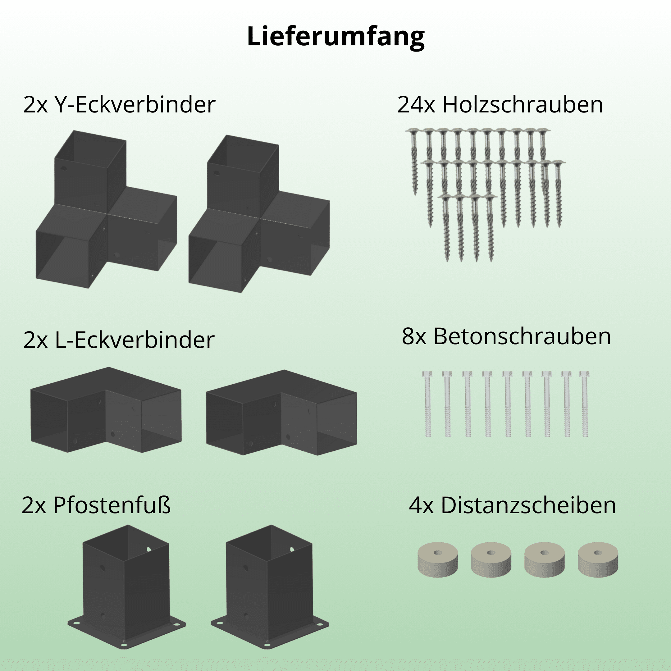 RemarqueLes poutres en bois nécessaires (100x100 mm) ne sont pas comprises dans la livraison et doivent être achetées séparément. Ainsi, les dimensions peuvent être choisies individuellement.
