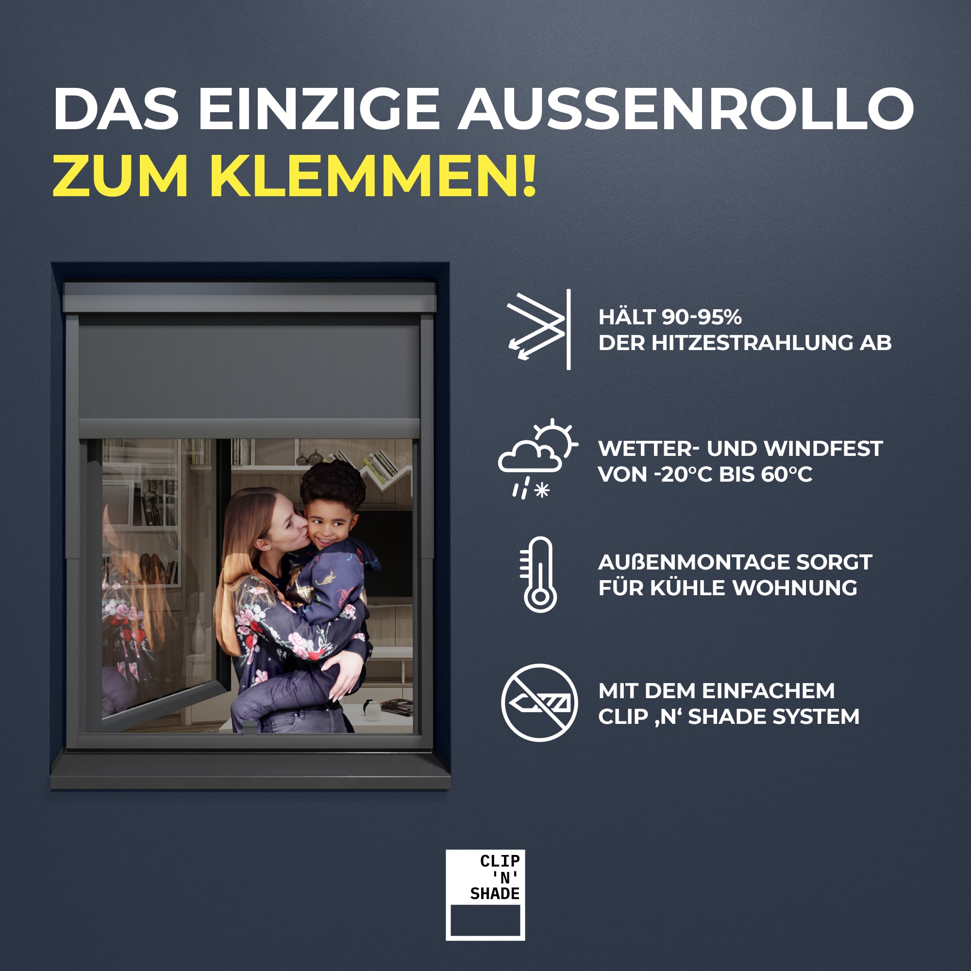 Le store extérieur CLIP'N'SHADE est une store à pincerque l'appartement protège efficacement de la chaleur. Il se fixe simplement à la fenêtre à l'aide de cinq clips - le montage ne prend que quelques minutes et peut être effectué par tout un chacun. Le montage ne nécessite pas d'échafaudage, car il peut être effectué de l'intérieur. Bien entendu, il n'est pas non plus nécessaire de percer ou de visser dans la fenêtre ou la façade. Comme il est fixé à l'extérieur de la fenêtre, le verre spécial reflète la lumière du soleil. Tissu de protection contre la chaleur les rayons de chaleur du soleil. L'apport de chaleur est ainsi réduit de plus de 90% et l'appartement reste frais !