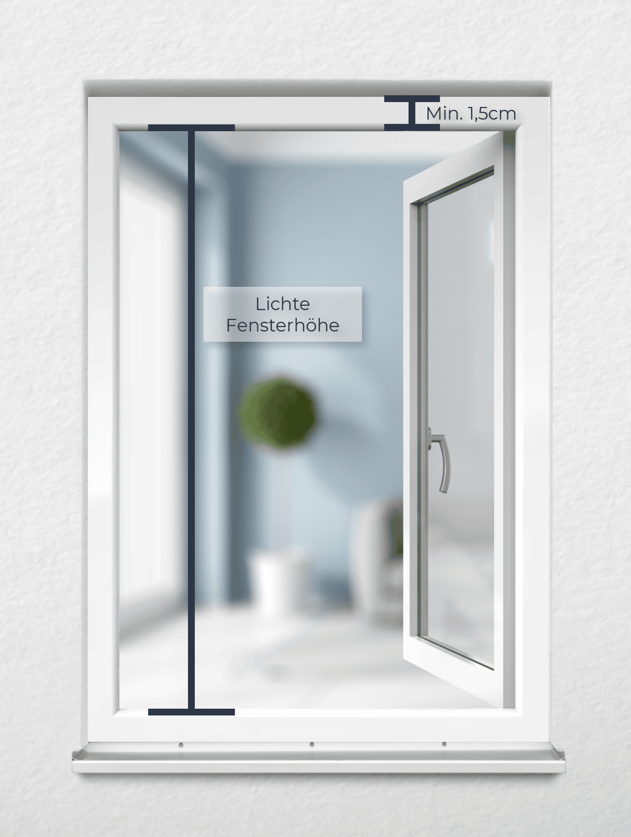 - Mesure, comme indiqué sur l'image, la hauteur intérieure de ta fenêtre (ouverte !). IMPORTANT : le cadre de la fenêtre doit être visible en haut à l'extérieur sur au moins 1,5 cm !