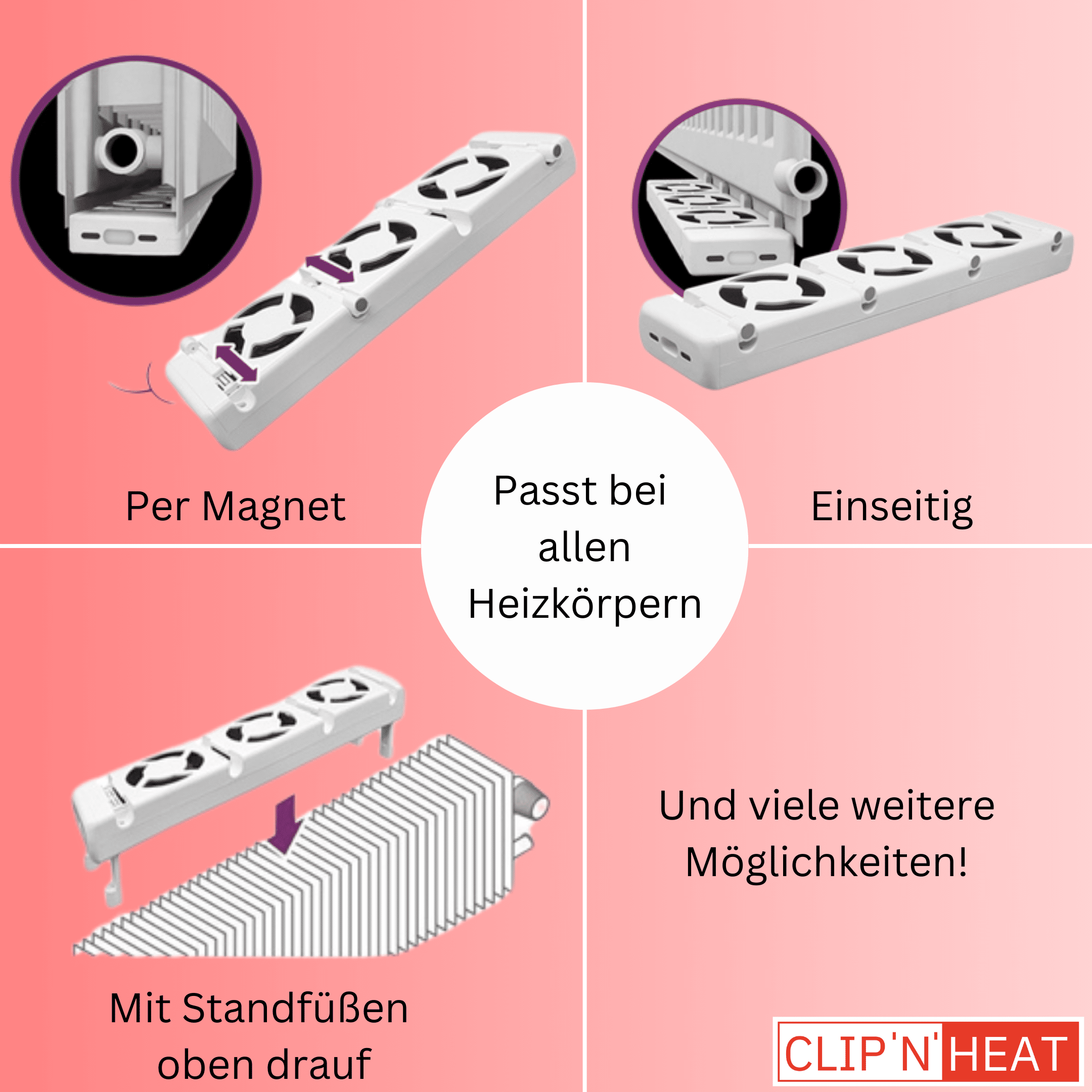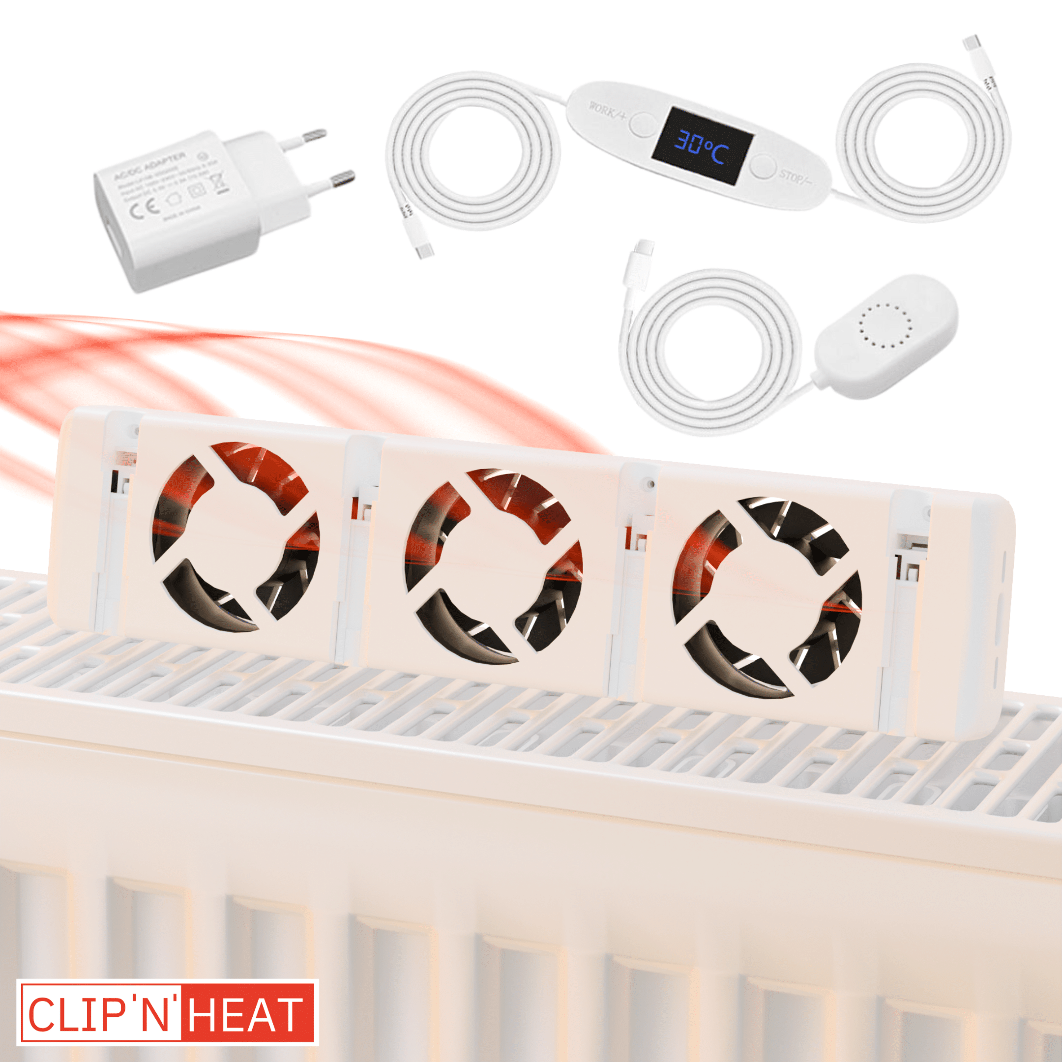 CLIP'N'HEAT accélère le chauffage de votre pièce, permet d'abaisser le thermostat de 1 à 2 °C et d'économiser jusqu'à 22 % sur les coûts de chauffage. Son installation simple et son fonctionnement silencieux en font la solution idéale pour un chauffage efficace et un confort accru dans votre maison. Augmentez l'efficacité thermique tout en profitant d'une température ambiante agréable - avec le ventilateur de radiateur CLIP'N'HEAT Single Set.